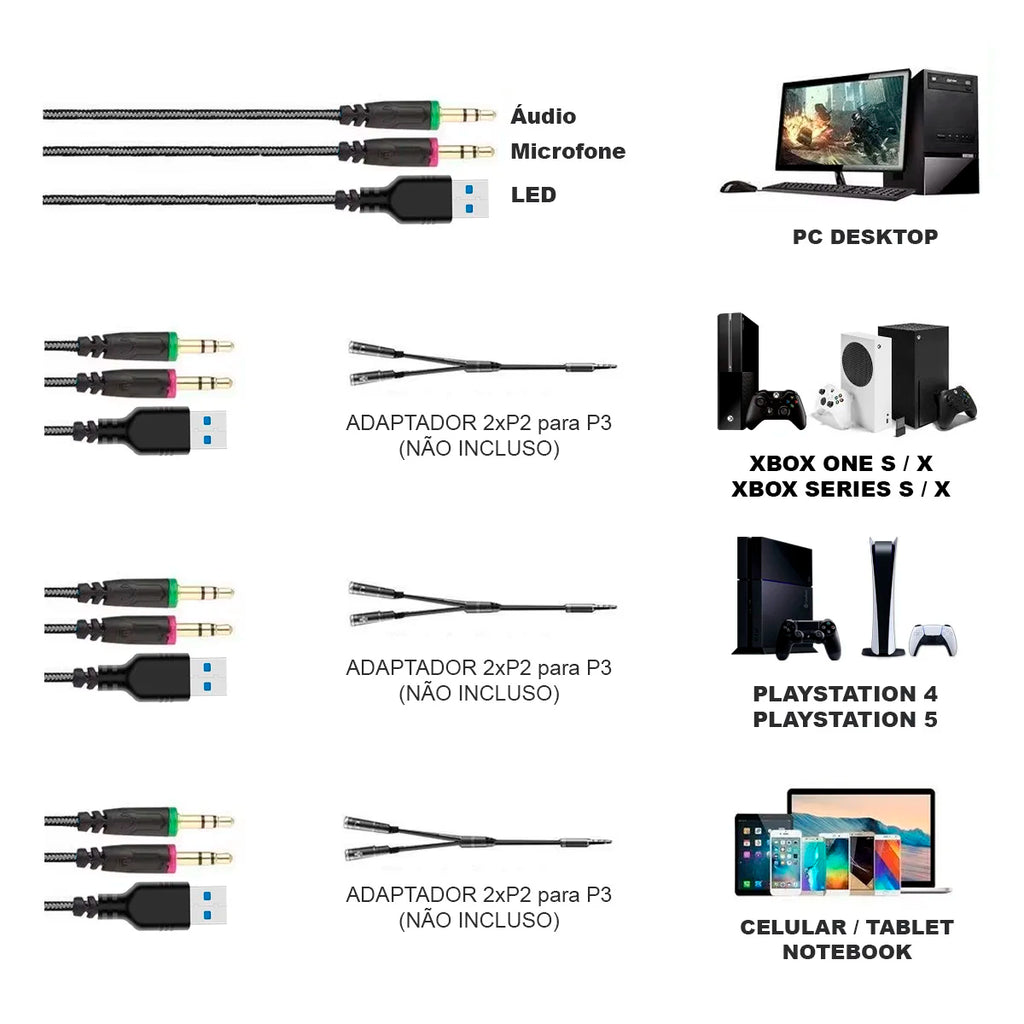 🔌 Conector P2 + USB (áudio/mic + iluminação)